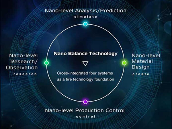 Toyo Tires proprietary material design technology that integrates four nano-level systems of “research, analysis, material design, and processing.”